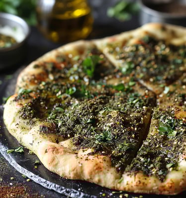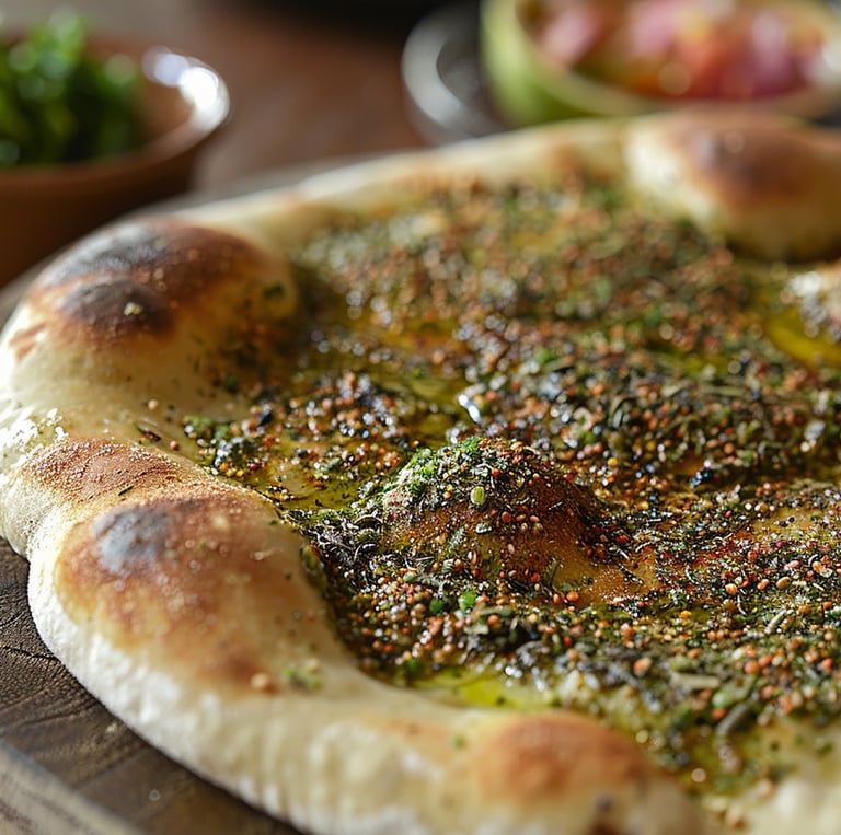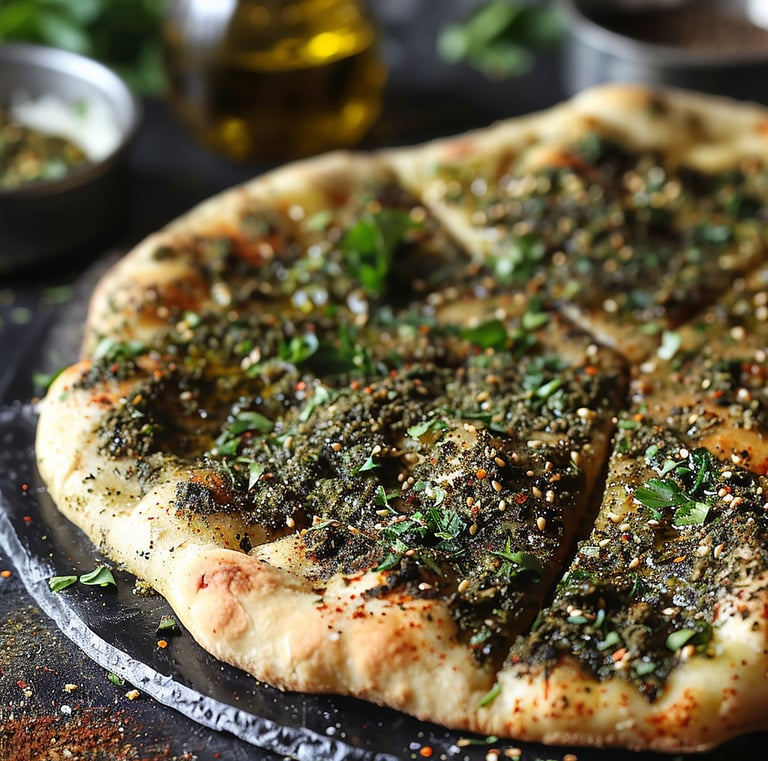 Close-up of golden manakish topped with vibrant zaatar and melted cheese fresh from the oven
