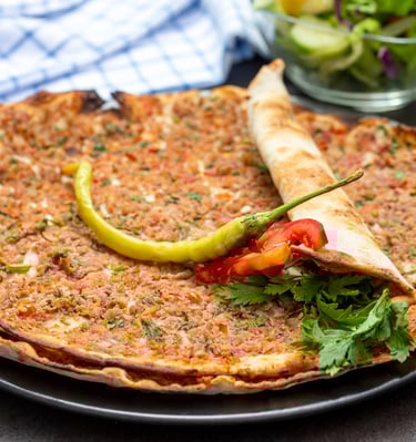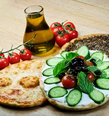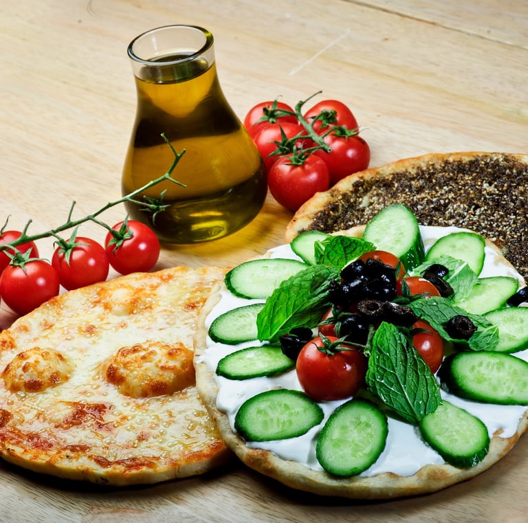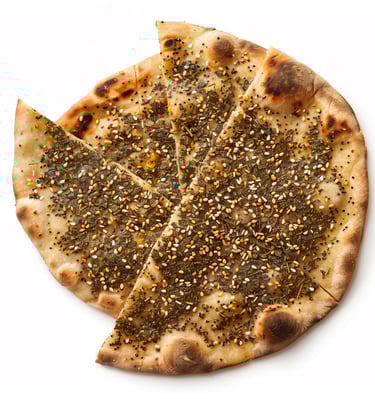 Zaatar, cheese, or meat toppings on warm, soft flatbreads